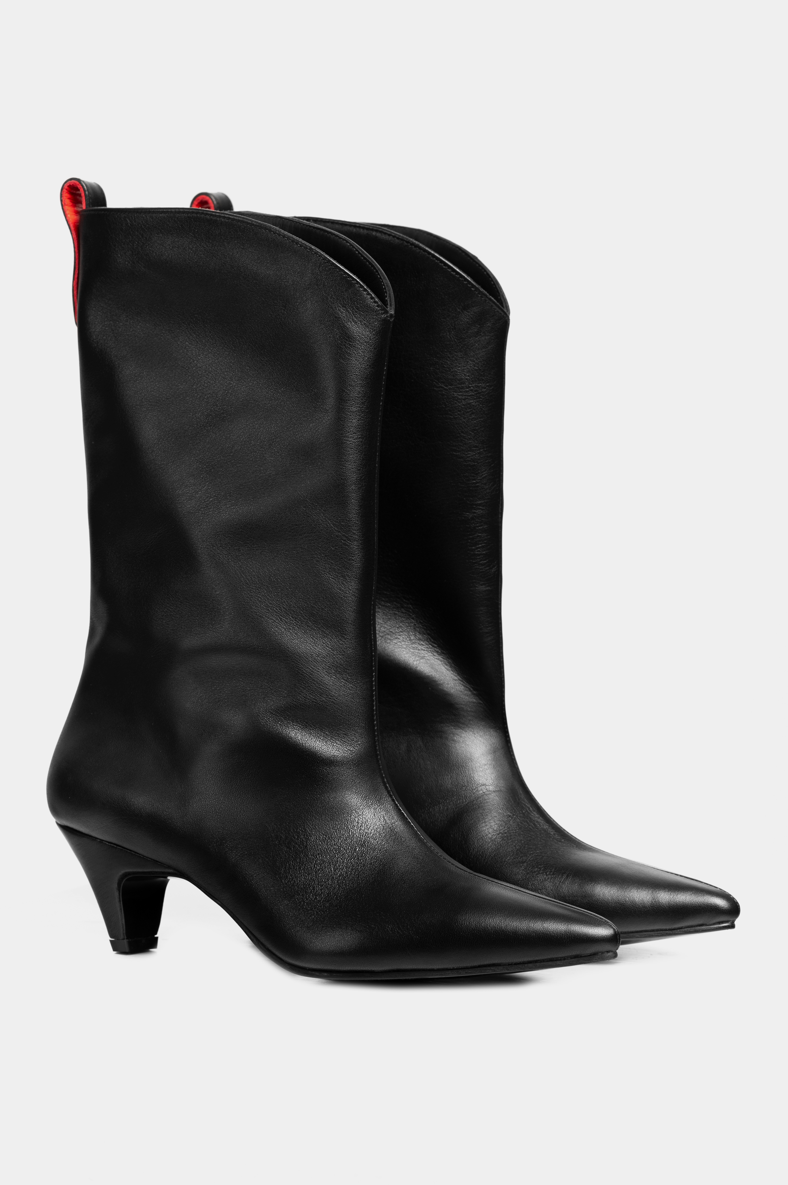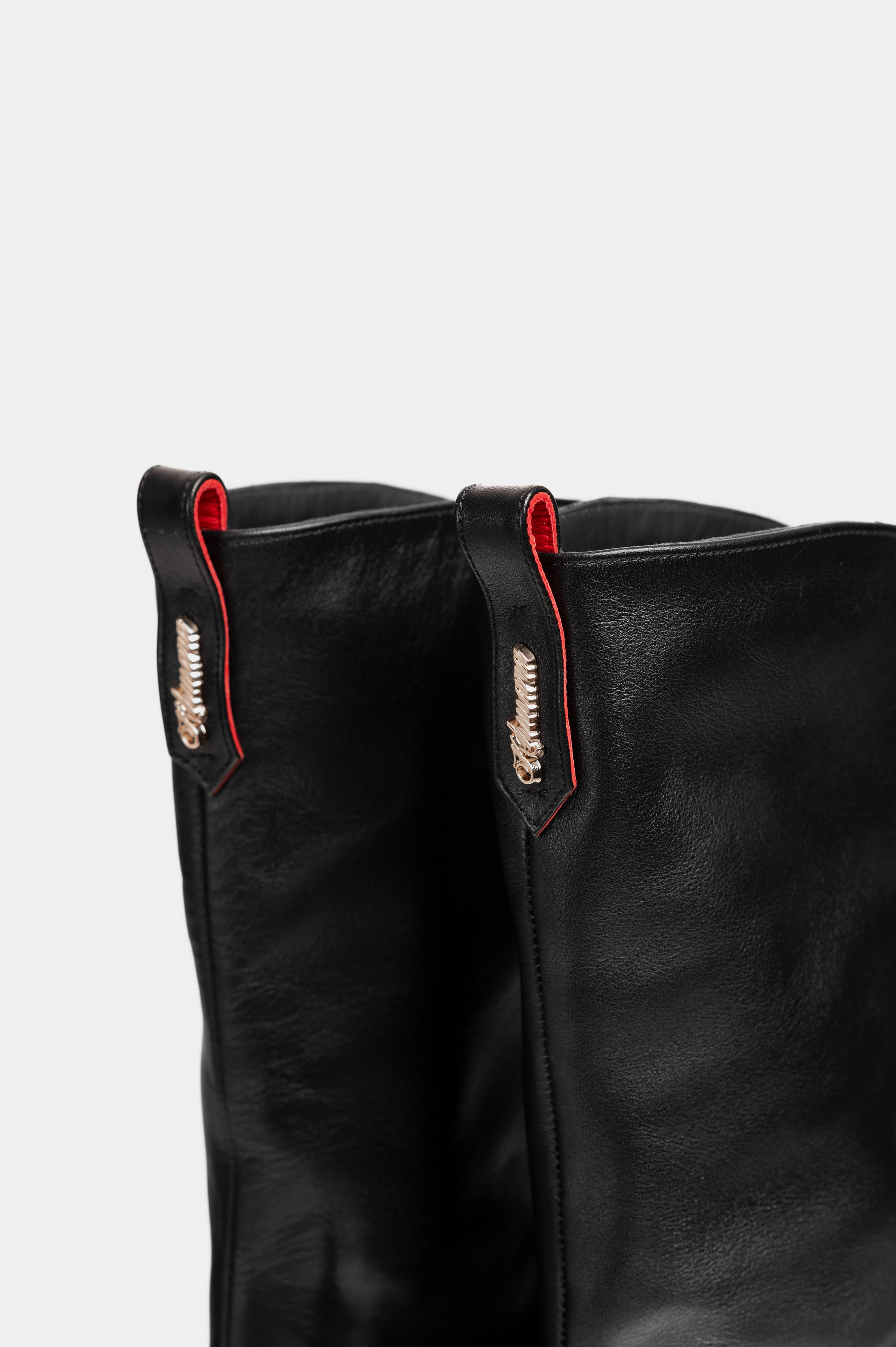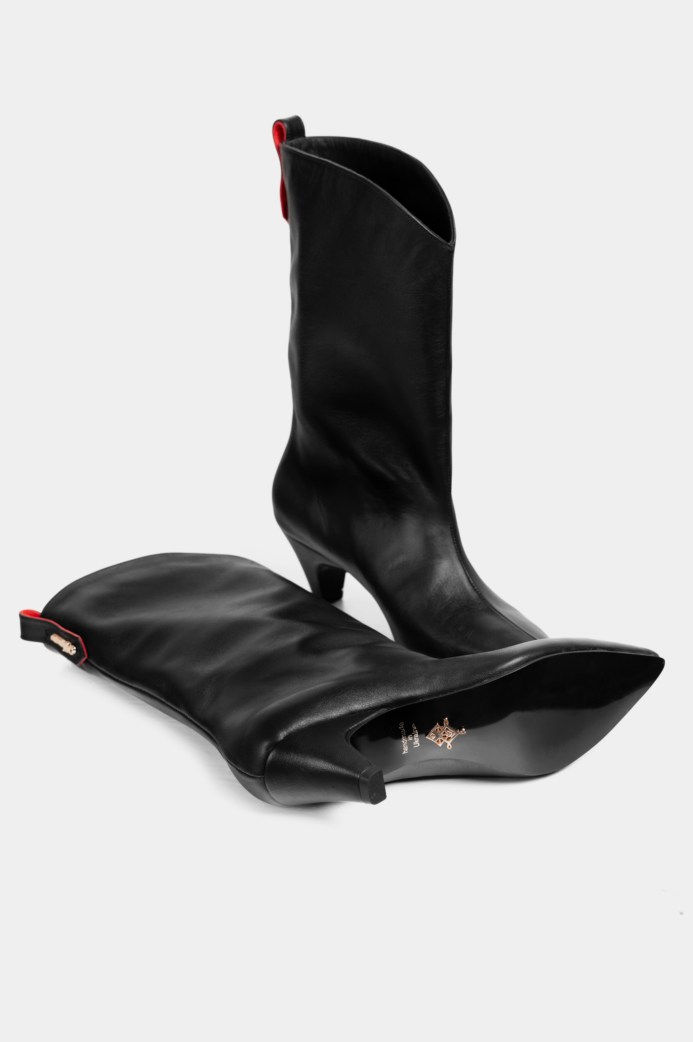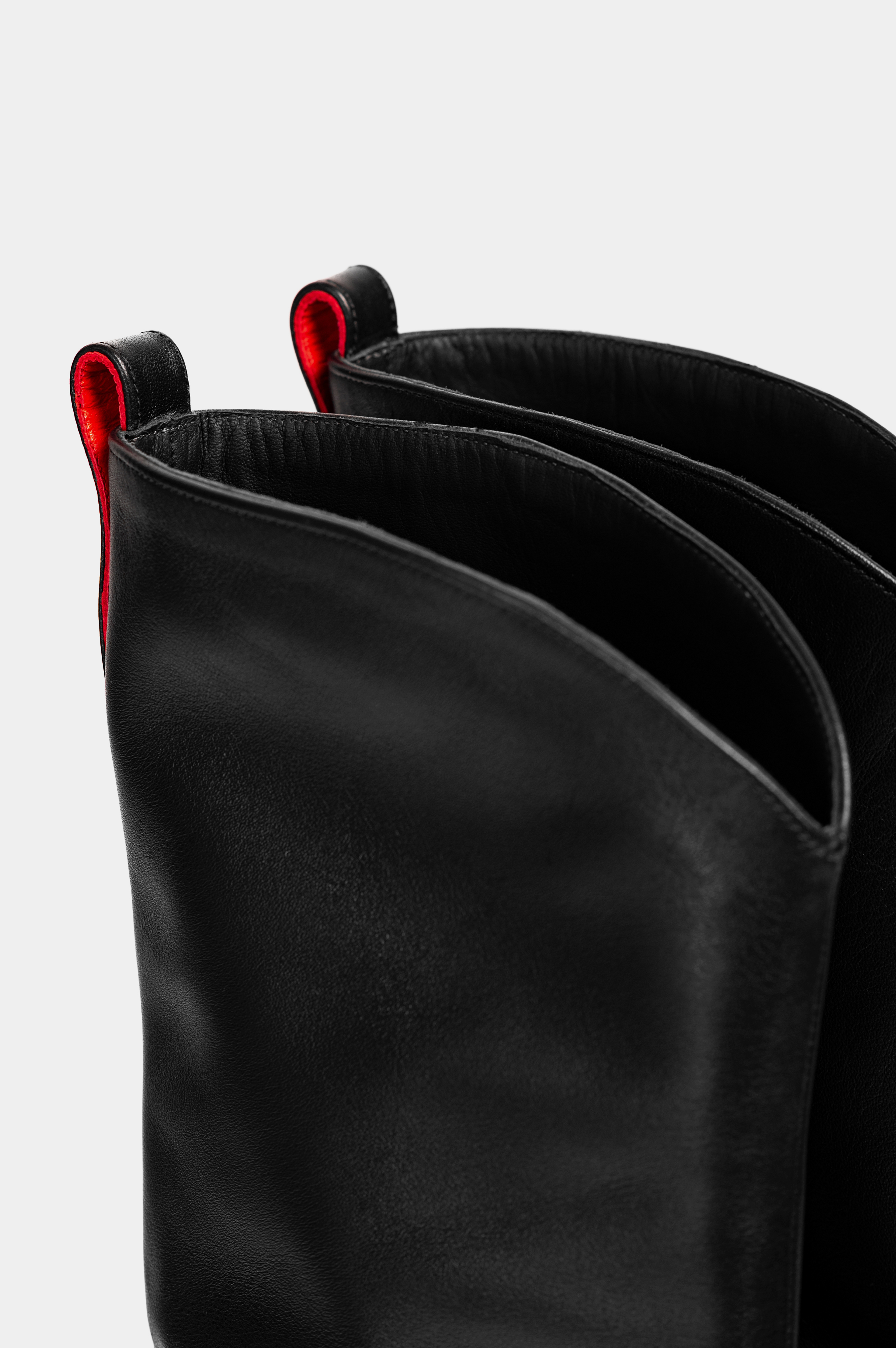 Чоботи які ідеально поєднують сучасну елегантність та нотки ковбойського шику. Виготовлені з високоякісної, м'якої натуральної шкіри, що забезпечує ідеальну посадку та довговічність. Всередині підкладка теж з натуральної шкіри у тон до верху. Висока халява, загострений носок ідеальної форми та стійкий, зручний підбор створюють витончений та граціозний силует. Мінімалістичний чорний дизайн доповнений яскравим червоним акцентом на задній петлі — деталь, що привертає увагу та додає характеру. Ці чоботи стануть ідеальною інвестицією у ваш гардероб. Вони легко поєднуються як із класичними сукнями та спідницями, так і з повсякденними джинсами.